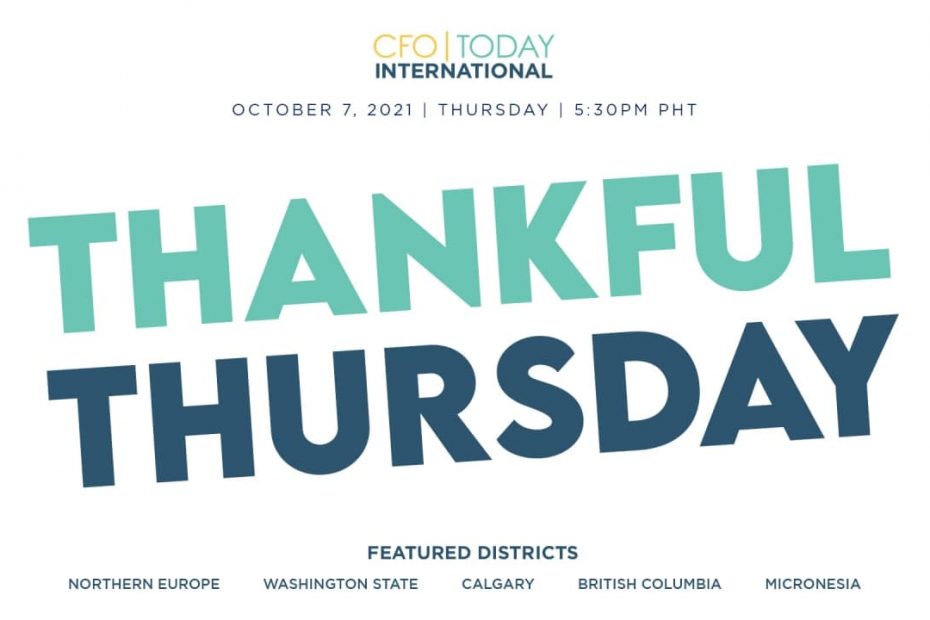 CFO Today International | October 7, 2021 | Thursday | 5:30PM PHT THANKFUL THURSDAY It’s not the things we lack, but the things we have. Even though we sometimes feel impatient, weary and anxious; Faith, time, and prayers all work wonders especially when you begin your day with gratitude. Please LIKE, SHARE, SUBSCRIBE and FOLLOW our Official CFO Pages!www.instagram.com/inc_cfowww.twitter.com/inc_cfowww.facebook.com/ChristianFamilyOrganizationswww.youtube.com/IglesiaNiCristoChristianFamilyOrganizations YouTube Premiere Link:https://www.youtube.com/watch?v=h6JlR5pxhzQ Facebook Live Link:https://www.facebook.com/events/6211620725546040/